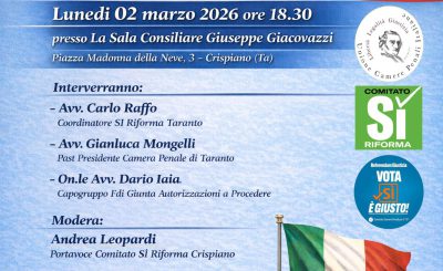 VERSO IL REFERENDUM CONSUNTIVO SULLA GIUSTIZIA: LE RAGIONI DEL SI Il gruppo politico INSIEME organizza un incontro pubblico sul tema: “Le ragioni del SI al referendum costituzionale sulla giustizia”, previsto il giorno 2 Marzo 2026 alle ore 18.30 presso la sala consiliare del Comune di Crispiano Interverranno: – Avv. Carlo…