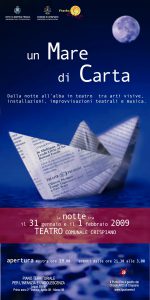 A cavallo di due giorni, tra la notte del 31 gennaio e la mattina del 1° febbraio prossimo, nel Teatro Comunale di Crispiano si terrà la notte bianca crispianese denominata “UN MARE DI CARTA” dalla notte all’alba tra arti visive, installazioni, improvvisazioni teatrali e musicali” , organizzata dal servizio “ Punto Erre ”, gestito dal Circolo Arci Crispiano, progetto inserito nel “Piano territoriale per l’infanzia e l’adolescenza” finanziato dai due comuni associati di Crispiano e di Martina Franca ai sensi della legge 285/97.