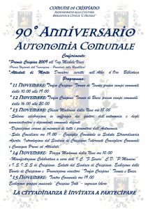 La Giunta Comunale di Crispiano, con atto n. 257 del 05.11.2009 ha indetto le celebrazioni per ricordare tutti i promotori dell’Autonomia Comunale, i numerosi Amministratori, Commissari straordinari e Dipendenti comunali, che in questo lungo periodo si sono adoperati per il progresso civile del paese e il benessere della Comunità crispianese.