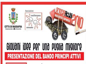 Giovedì 6 maggio alle ore 18,00 presso la Sala Consiliare del Comune di Massafra verrà presentato l’attesissimo bando “Principi Attivi” del programma regionale “Bollenti Spiriti”, pubblicato nel BURP n.37 del 25 febbraio 2010.