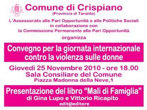 Giovedì 25 Novembre 2010 alle ore 18.00 presso la sala consiliare del comune di Crispiano si terrà un convegno sulla giornata internazionale contro la violenza sulle donne.