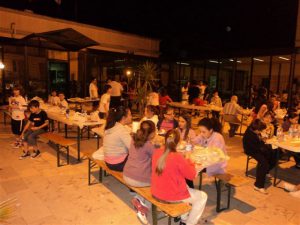 Invertiti i gruppi , giungeva l’attesa ora della cena sul piazzale della biblioteca, consumata con le note virtuose del mandolino dell’ottantaquattrenne Peppino Carrieri. Ognuno ha potuto assaggiare le prelibatezze, preparate dai genitori degli altri.