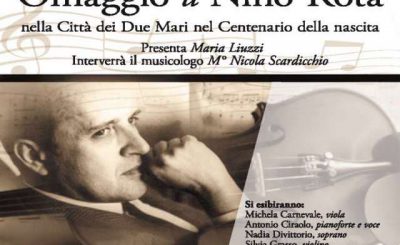 Giovedì 6 Ottobre alle ore 20.30 presso il Salone di Rappresentanza dell’Istituto Musicale Paisiello di Taranto, al Palazzo d’Ayala Valva in Via Anfiteatro 11, si terrà l’evento musicale “Omaggio a Nino Rota nella Città dei Due Mari nel centenario della nascita”. La serata si propone di far conoscere meglio al…