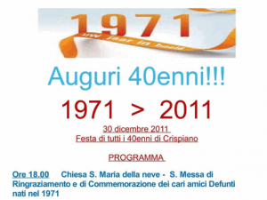 Ore 18.00 Chiesa S. Maria della neve – S. Messa di Ringraziamento e di Commemorazione dei cari amici Defunti nati nel 1971