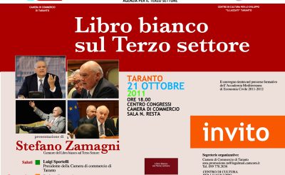 Gentili sigg.ri, abbiamo il piacere di invitarVi al convegno organizzato per il giorno 21 Ottobre p.v. dalla Camera di Commercio di Taranto, in continuità con il lavoro intrapreso con il Centro di Cultura ‘G. Lazzati’ di Taranto e la nascente Accademia Mediterranea di Economia Civile. L’evento si terrà alle ore…