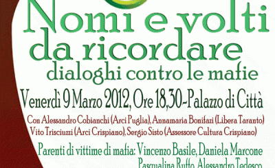 Incontro con: Alessandro Cobianchi, referente per la Puglia di Libera e Presidente Regionale Arci, Annamaria Bonifazi, responsabile di Libera Taranto, Vito Trisciuzzi del Circolo Arci Crispiano e l’assessore alla Cultura del Comune di Crispiano, Sergio Sisto, converseranno con: Pasqualina Ruffo (figlia del ferroviere Nicola Ruffo, ucciso il 6 febbraio 1974…