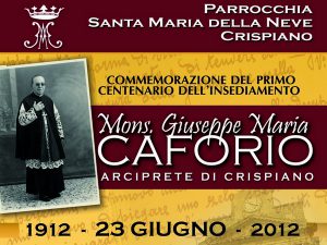 23 giugno 1912: una data importante per Crispiano. In quel giorno veniva ufficialmente insediato il nuovo parroco dell’unica parrocchia del paese, Santa Maria della Neve. Si trattava di un giovane sacerdote, don Giuseppe Maria Caforio, originario di Martina Franca. Aveva 34 anni. Era nato nel 1878, e fu ordinato sacerdote nel 1903. Fu insediato quale arciprete della nostra cittadina durante la visita pastorale tenuta dall’arcivescovo Cecchini e rimase a Crispiano ininterrottamente per 53 anni, fino alla morte, sopraggiunta il 16 luglio 1965. Crispiano era una borgata dipendente da Taranto, sarebbe divenuta comune autonomo solo nel 1919. Don Caforio trovò una comunità disorientata, una chiesa fatiscente, arredi sacri in pessime condizioni e soprattutto una vita religiosa ridotta ai minimi termini. Il giovane arciprete si mise subito al lavoro. Il suo amore a Gesù Eucarestia e alla Vergine Maria, unito a una solida formazione e a una vera pietà, fece il resto. Lo possono testimoniare oggi i nostri anziani, che se lo ricordano bene. Lo possono testimioniare i sacerdoti che si sono avvicendati come parroci della chiesa madre, che hanno costatato i benefici effetti della sua azione pastorale. Per questo, sabato 23 giugno 2012 la parrocchia di Santa Maria della Neve ha promosso una serata celebrativa che prevede alle ore 19,00 la santa Messa presieduta da S. E. Mons. Pierino Fragnelli, antico chierichetto dell’arciprete e ora vescovo di Castellaneta e subito dopo la commemorazione a più voci con l’avv. Angelo Carmelo Bello (“Crispiano e la sua parrocchia all’arrivo di mons. Caforio”), don Dino Lepraro (“Io, il vice parroco di mons. Caforio”), don Franco Semeraro (“L’uomo della preghiera e del sacrificio”) e alcune brevi testimonianze dalla viva voce dei fedeli. I lavori saranno introdotti da don Michele Colucci, parroco di Santa Maria della Neve, e moderati da mons. Carmine Agresta, parroco emerito della chiesa madre e vicario episcopale per la pastorale. Le conclusioni saranno affidate a mons. Pierino Fragnelli. A suggello della serata, la benedizione della nuova “campana dell’arciprete”, donata da una coppia di benefattori, sulla quale è stata incisa l’iscrizione: “1912 – 23 giugno – 2012: nel primo centenario dell’arrivo a Crispiano dell’arciprete mons. Giuseppe Maria Caforio”.