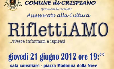 Giovedì 21 giugno alle 19.00 si terrà a Crispiano presso la sala consiliare in piazza Madonna della neve un incontro dal titolo “RiflettiAMO…vivere informati e ispirati”. Un incontro che non vuole essere esaustivo, ma semplicemente ispiratore, sul come affrontare le tematiche scottanti di questo periodo. Gli ospiti, così diversi tra…