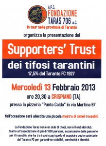 FONDAZIONE TARAS A CRISPIANO 13 Febbraio 20138 Dicembre 2017sport Nell’ambito della Campagna Associativa 2013, continua il piccolo tour per la Provincia di Taranto, al fine di presentare e far conoscere la mission associativa della Fondazione Taras. Fonte: EMIDIO ATTAVILLA