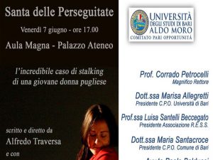 Un’esaltante rappresentazione sullo Stalking è avvenuta a Bari, dove si è svolta una Piece teatrale con testi scritti dal notissimo regista Alfredo Traversa. Nella favolosa cornice dell’Aula Magna dell’Università Aldo Moro del capoluogo Pugliese, è andato in scena “ Santa delle Perseguitate” un atto unico che ha emozionato tutta la platea comprendente personalità autorevole dell’Università e rappresentanti del mondo culturale della città. Nell’Aula Magna occupata in ogni ordine di posto – in massima parte donne – in un’atmosfera coinvolgente si è rappresentata la tragica vicenda realmente accaduta a una giovane di ventitré anni, scomparsa per mano di un uomo che la pugnalò con ferocia omicida. La trama del racconto potrebbe sembrare quasi l’assuefatta e quotidiana storia di femminicidio che accade in Italia. Una sequenza aberrante ai giorni nostri che riesce amaramente a riempire le cronache dell’informazione. La magistrale interpretazione degli attori, ha interessato tutti i presenti che hanno apprezzato le doti del “ Deus ex machina” Alfredo Traversa, che oltre a scrivere i testi è stato voce narrante e interprete, accompagnato da una stupenda interpretazione artistica dell’attrice Tiziana Risolo di Taranto, che con la sua capacità espressiva ha calamitato l’attenzione generale. Per l’intero svolgimento di “Santa delle Perseguitate” i due attori hanno annullato il divario che a volte si crea a teatro con imprevisti recitativi, quanto tutto avviene mentre il pubblico sta ad ascoltare. Nell’aula Magna dell’Università di Bari invece, gli attori hanno trasmesso agli spettatori un Pathos intriso di suspense man mano che l’azione teatrale si svolgeva. La bravissima Tiziana, attrice dalle caratteristiche naturali che solo alcune dive del teatro possiedono, con la magia della sua voce rievocava momenti del teatro Shakespeariano come in “ La Tempesta” dove il personaggio “ Ariel” impersona la coscienza cui obbedire. Nell’Aula Magna si avvertiva la sensazione che l’attrice fosse a fianco di ognuno e, oltre a sussurrare il racconto, penetrava l’indole positiva di ciascuno, dandone responsabilità con la consapevolezza che storie di Stalking non dovrebbero mai più avvenire, o almeno, impedire che accadono. La triste vicenda vide la scomparsa di una povera ragazza a soli ventitré anni esattamente nel 1991 a Bari al Rione Santo Spirito. Ci preme dire che l’emozione ha attraversato gli spettatori e che è visibilmente emersa anche dalle voci dei due attori. Senza timore di smentite, raramente si assiste a teatro un ascolto compartecipato senza una minima distrazione. L’intera rappresentazione ha avuto momenti d’ispirazione di teatro Brechtiano. Le crudeltà delle vicende a volte nascoste che alcune donne subiscono in silenzio, la bravura del regista è riuscita a trasmetterle all’attenta platea. Al termine, ai due attori – Tiziana e Alfredo – meritoriamente gli è stata riservata un’ovazione calorosa con interminabili applausi. La conclusione della serata ha visto interventi dei rappresentanti delle diverse Associazioni Culturali anti-Stalking che operano sul territorio.