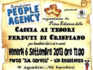 Venerdì 6 Settembre 2013 dalle ore 17.00 presso il parco comunale S. M. Goretti di Crispiano, in Viale della Resistenza, sedici bambini si sfideranno nella prima “Caccia ai tesori perduti dei Crispiano”, ideata dal presidente dell’associazione People Agency Sergio Sisto e dallo scrittore Giorgio Rossano,socio dell’associazione.