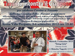 Il 2 settembre le navi scuola della Marina Militare giapponese ormeggeranno presso la Stazione Navale Mar Grande di Taranto. Le due navi in arrivo sono la “Shirayuki” e la “Isoyuki”. Il viaggio di addestramento dei cadetti della Marina giapponese, istituito nel 1957 al fine di addestrare i giovani cadetti e di instaurare delle relazioni amichevoli presso i porti di scalo, giunge alla sua 57a edizione, e approda per la prima volta a Taranto. In occasione dell’arrivo delle navi scuola a Taranto, l’Ambasciata del Giappone, in collaborazione, tra gli altri, con il Comune di Taranto, l’Istituto Giapponese di Cultura in Roma e la A.S.D. Bunkai Karate, organizza martedì 3 e mercoledì 4 settembre presso l’Arena di Villa Peripato (ingresso Via Pitagora), per due serate consecutive, un evento ad ingresso libero interamente dedicato alla cultura giapponese. A presentare le due serate la giornalista dell’emittente televisiva TG Norba 24 Maria Liuzzi. Per entrambe le serate dalle 19.40 è previsto un nutrito programma volto a presentare ai cittadini di Taranto vari aspetti della cultura giapponese, dalle arti marziali, alla storia, al cinema. Per iniziare, una dimostrazione di karate a cura del Maestro Antonio Lobello, distintosi più volte in competizioni nazionali, e dei suoi allievi. Dopo i saluti istituzionali, per celebrare il ricorrere nel 2013 del 400° anniversario della partenza della cosiddetta “ambasceria verso l’Europa dell’era Keicho” (Keicho kenou shisetsudan), prima ambasceria ufficiale dal Giappone, lo storico Professor Antonio Fornaro presenterà il diario di viaggio “Historia del regno del VOXV del Giapone, dell’antichità, nobiltà, e il valore del suo re Date Masamune” redatto da Scipione Amati, interprete al seguito dell’ambasceria. A seguire, due proiezioni cinematografiche: martedì 3 settembre, “Swing Girls” (Swing Girls) di Shinobu Yaguchi, storia adolescenziale di un gruppo di ragazze liceali del Tohoku che, tra risa ed emozioni, mette su una jazz band; mercoledì 4 settembre, “Il samurai del tramonto (Tasogare Seibei) che segna il debutto del regista Yoji Yamada, personalità di spicco nel mondo del cinema giapponese, nel “jidai geki” (opere ambientate nel periodo Edo, l’epoca dei samurai).