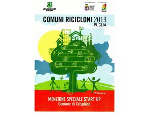 Martedì 10 Dicembre 2013, nell’ambito dell’iniziativa “Comuni Ricicloni Puglia 2013” promossa da Legambiente Puglia con il patrocinio di ANCI Puglia ed il contributo della Regione Puglia –Assessorato alla qualità dell’ambiente, finalizzata a valorizzare le migliori esperienze dei comuni pugliesi in tema di gestione di rifiuti, il Comune di Crispiano è stato premiato con la Menzione Speciale Start Up . Il riconoscimento spettava a tutti i comuni che, nell’anno 2013, hanno avviato un sistema di raccolta differenziata innovativa, riuscendo ad ottenere nei primi mesi di avvio del servizio, una percentuale di raccolta differenziata ( RD) superiore al 50%, nel caso del nostro comune la RD è stata superiore al 70%. In Puglia il 59% dei rifiuti urbani prodotti viene ancora smaltita in discarica e la raccolta differenziata è ferma a percentuali ancora troppo basse, intorno al 18%. Il riconoscimento va esteso, in primis, a tutti i cittadini di Crispiano che hanno ben compreso l’importanza della raccolta differenziata per la salvaguardia dell’ambiente, della salute e della qualità della vita presente e futura diventando protagonisti di un cambiamento culturale e di abitudine di vita. Inoltre, va riconosciuto, anche, l’impegno di tutti gli operatori della ditta appaltatrice, del dirigente dell’ufficio Ambiente ed Ecologia del Comune di Crispiano e dei suoi collaboratori, dell’amministrazione precedente per l’avvio del servizio di raccolta differenziata, e sopratutto del nostro sindaco, che, in prima persona, con l’ausilio del comandante dei vigili urbani, ha esercitato un’azione preventiva e repressiva nei confronti di tutti quei cittadini che si ostinavano a non rispettare le direttive del nuovo servizio abbandonando i propri rifiuti per le vie periferiche del paese. L’obbiettivo dell’amministrazione comunale , così come è stato esposto durante il convegno, è quello di ottimizzare, ulteriormente, il servizio di raccolta ed incentivare i cittadini al fine di raggiungere percentuali di differenziata tali da poter essere considerati tra i Comuni ricicloni arrivando quasi ad essere “ rifiuti free” ovvero comune dove si è riusciti a ridurre del 90% circa la quantità di rifiuti da smaltire. E’ un traguardo ambizioso, ma possibile, bisogna responsabilizzare, ulteriormente, i cittadini attraverso una comunicazione efficace, con politiche fiscali che applicano il principio del “ chi inquina paga” e premino il cittadino virtuoso che separa bene i materiali da reciclare. Bisogna promuovere la riduzione della produzione dei rifiuti, riducendo l’utilizzo delle bottiglie e delle stoviglie di plastica a favore di quelle riutilizzabili ed incentivare il compostaggio domestico e il consumo dell’acqua pubblica, realizzando, per esempio, il “ Fontanile del Sindaco” che dispensa acqua controllata e depurata a basso costo.