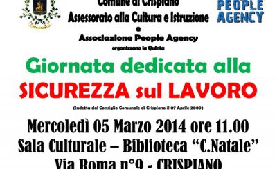 Mercoledì 05 marzo 2014 presso la Sala Culturale della Biblioteca civica “C.Natale” di Crispiano in via Roma 9, dalle ore 11.00, organizzata dall’assessorato alla cultura del Comune di Crispiano e dall’associazione culturale People Agency sarà celebrata la quinta “Giornata dedicata alla sicurezza sul lavoro” indetta dal Consiglio Comunale di Crispiano…