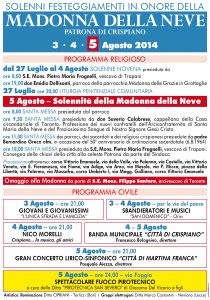 Il giorno centrale della festa è martedì 5 agosto, solennità della Madonna della Neve, festa idealmente collegata alla solennità di Santa Maria Maggiore in Roma: il soffitto della chiesa madre di Crispiano riprende architettonicamente, anche se in maniera più modesta, il soffitto della celebre basilica romana. La pia tradizione vuole che sia stata la Vergine Maria a indicare e ispirare la costruzione della sua dimora sull’Esquilino. Apparendo in sogno contemporaneamente al patrizio Giovanni e al Papa Liberio (352-366), la Madonna chiese la costruzione di una chiesa in suo onore, in un luogo che lei stessa avrebbe miracolosamente indicato. E infatti, la mattina del 5 agosto 358 il colle romano dell’Esquilino apparve inspiegabilmente ammantato di neve. Il Papa tracciò il perimetro della nuova chiesa e il nobile Giovanni provvide al suo finanziamento. L’arrivo a Crispiano di questo titolo attribuito alla parrocchia si deve all’arcivescovo De Fulgure, che nel 1826 fondava la parrocchia crispianese, quando Crispiano era ancora un villaggio dipendente amministrativamente da Taranto (sarebbe divenuto comune autonomo nel 1919). Da allora il popolo di Crispiano si è messo sotto la protezione di Maria e ancora oggi la festa richiama un gran numero di crispianesi che per vari motivi dimorano lontano dal paese d’origine. Nella mattinata del 5, sante Messe: alle ore 8,00 presieduta dal parroco; alle ore 9,30 presieduta da don Saverio Calabrese, cappellano della Casa circondariale di Taranto, già parroco di Santa Maria della Neve; alle ore 11,00 presieduta da padre Bernardino Greco dei Frati minori, che celebra il 50° anniversario di ordinazione sacerdotale: questa celebrazione vede la presenza dei parroci di Crispiano e dei sacerdoti e religiosi di origine crispianese. Alle ore 18,00 santa Messa presieduta da S.E. Mons. Pietro Maria Fragnelli, vescovo di Trapani. Subito dopo, in piazza Madonna della Neve, la tradizionale consegna delle chiavi della città alla celeste Patrona da parte del sindaco Egidio Ippolito, cerimonia molto attesa e sempre ricca di suggestione, che precede la tradizionale, partecipatissima processione dell’immagine della Madonna della Neve per le vie del paese, protagoniste anch’esse con i loro abitanti di un vero e proprio tripudio di gioia al passaggio della Madonna, che col suo sguardo benedicente saluta ammalati e persone altrimenti impossibilitate a uscire di casa. Al rientro della processione, tutta la popolazione si unisce nella preghiera intonando l’inno alla Madonna della Neve, composto da mons. Giuseppe Maria Caforio (1878-1965), per oltre mezzo secolo arciprete di Crispiano. Il tradizionale omaggio a Maria al termine della processione è affidato quest’anno a S.E. Mons. Filippo Santoro, arcivescovo di Taranto. Subito dopo, l’esibizione del Gran Concerto bandistico lirico-sinfonico “Città di Martina Franca”. A mezzanotte, spettacolo pirotecnico in via Foggia.