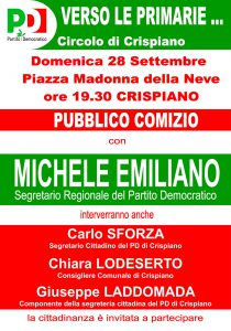 Domenica 28 settembre 2014 dalle ore 19.30 in Piazza Madonna della Neve in Crispiano, si terrà un pubblico comizio organizzato dal circolo cittadino del Partito Democratico.