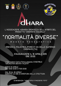 L’Associazione ADHARA è lieta di invitarVi a vedere la mostra fotografica dal titolo “NORMALITA’ DIVERSE” che sarà innaugurata all’interno della nuova sede del Poliambulatorio, Distretto nr. 5 TA/1, di Crispiano (TA) il 18 aprile sino al 28 aprile. La mostra fotografica si affiancherà al progetto ___ “Crispiano Solidale”_____ ideato e promosso dal Dott. Giuseppe Laddomada, consigliere del Comune di Crispiano. Il progetto mira a sensibilizzare l’opinione pubblica ponendo l’accento su situazioni di disagio sia in campo sociale che medico, “Normalità diverse” che quotidianamente vengono vissute nella vita di tutti giorni. Fotograficamente, il tema è stato affrontato in maniera alquanto libera, senza limitare il contesto solo ad esclusivamente al settore medico-sociale. Al termine della mostra, la giuria tecnica proclamerà un vincitore, le foto classificate nei primi tre posti, saranno donate alla struttura ospitante e destinate ad un’esposizione permanente. L’Associazione Adhara si riserva il diritto di diffusione delle fotografie attraverso i vari network. L’evento usufruirà del patrocinio morale del Comune di Crispiano, dalla Provincia di Taranto, nonchè dalla Regione Puglia. Si vuole ringraziare l’organizzazione WELCOME PASSIONE FOTO, NELLA PERSONA DI Tiziana Ruggieri, l’associazione Cantus Firmus per l’organizzazione dell’evento musicale che si terrà la sera dell’innaugurazione 18 aprile 2015 alle ore 20,00 ENSEBLE “ORCHESTRA GIOVANI TALENTI”.