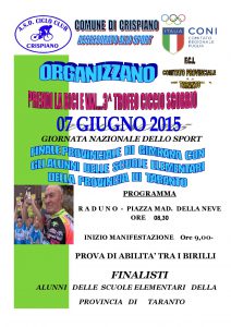 Programma: Raduno Piazza Madonna della neve ore 08,30. Inizio manifestazione alle ore 9,00. Finale provinciale di gimkana con gli alunni di 5^ elementare della scuola Mancini di Crispiano e delle scuole elementari della provincia di Taranto