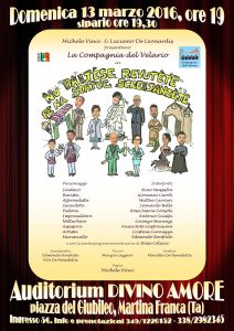Un altro appuntamento nella provincia per la nuova commedia della compagnia crispianese, “Nu paijése revutète, pe na statue screijanzète”. In attesa dell’apertura del Teatro comunale di Crispiano, il nuovo lavoro del VELARIO approda all’Auditorium DIVINO AMORE, in piazza del Giubileo a Martina Franca. L’appuntamento è domenica 13 marzo 2016 alle ore 19 (sipario ore 19,30). Il prezzo del biglietto e di 5€. Per informazioni e prenotazioni è possibile chiamare il 349-1220152 o il 338-2982345.