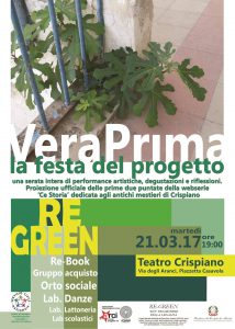 RICEVIAMO E PUBBLICHIAMO CRISPIANO Con “VeraPrima” l’Arci di Crispiano racconta due anni di attività Serata ricca quella di domani al teatro comunale crispianese: dalle ore 19 chi arriverà in piazzetta Casavola si immergerà in un percorso esperienziale. C’è attesa per la prima visione della webserie Ce storia Martedì 21 marzo, a partire dalle ore 19, al teatro comunale di Crispiano andrà in scena “VeraPrima” l’evento che intende raccontare il progetto Re-Green, un contenitore di laboratori, attività e iniziative messe in campo negli ultimi due anni dal circolo Arci “Mariella Leo” di Crispiano. Attraverso una serata di festa nel primo giorno di primavera, gli organizzatori vogliono condividere con la cittadinanza tutto quello che è stato realizzato e ciò che è ancora in corso di svolgimento nel paese delle Cento Masserie. Il progetto “Re-Green -Eco dei mestieri della legalità” è stato sostenuto dalla Presidenza del Consiglio dei Ministri. Il cuore della serata sarà la proiezione delle prime due puntate della webserie sugli antichi mestieri “Ce storia”, frutto del laboratorio condotto dagli attori Gaetano Colella e Andrea Simonetti con giovani e anziani del posto. Ma, prima di arrivare in platea, il pubblico dovrà effettuare un vero e proprio percorso esperienziale tra dei libri (quelli della rassegna letteraria “Re-Book” curata da Vincenzo Parabita) letteralmente da varcare e la testimonianza del locale Gruppo di Acquisto Solidale, che proprio qualche settimana fa ha compiuto un anno di vita. Ma ci sarà spazio anche per la musica popolare di Daria Falco e per i laboratori sui diritti rivolti ai più piccoli. A corollario dell’iniziativa, da parte degli organizzatori ci saranno ancora due inviti all’azione: il primo, rivolto ai giovani, è quello di prender parte a un laboratorio di lattoneria che partirà prossimamente all’Arci; il secondo, destinataria l’amministrazione comunale, riguarda la creazione di un orto sociale sinergico su un’area già individuata in paese. Allieterà l’evento la musica popolare (anch’essa protagonista di un laboratorio in questi mesi) di Daria Falco. La direzione artistica è di Paolo Elettrico.