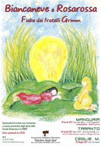COMUNICATO STAMPA “Biancaneve e Rosarossa”, teatro ed euritmia a Manduria, Taranto e Ceglie La rigenerazione dell’anima nella messinscena della scuola steineriana “La Fonte” Manduria (Ta), 27 aprile 2017 Sospesa in una dimensione aspaziale e atemporale, la fiaba è un genere narrativo capace di parlare al cuore dell’uomo di ogni luogo e di ogni tempo. Forse è per questo che l’Euritmia si dimostra essere una chiave espressiva assai confacente al fiabesco, grazie alla fusione contestuale di ritmo, respiro, forme e colori, con ispirate sollecitazioni sonore. Lo stesso insieme di contenuti che sarà proposto in tre date dallo spettacolo “Biancaneve e Rosarossa” dei fratelli Grimm, allestito dall’Associazione Pedagogica Steineriana “Il Giardino degli Ulivi” di Manduria, con la regia della Maestra di Euritmia Gabriella Pietrosanto e la collaborazione di Prosper Nebel, Maestro di Euritmia della Scuola Waldorf di Zurigo. La messinscena vedrà come protagonisti gli alunni della VII classe della Scuola Steineriana “La Fonte” di Manduria, alcuni alunni della Scuola Primaria e l’ex alunno Davide Dattis. Le musiche dello spettacolo, in parte tratte dal repertorio popolare italiano e in parte firmate da Salvatore Moscogiuri, saranno suonate da Giuseppe Moscato (pianoforte) e Francesca Lecce (flauto). La voce recitante sarà quella di Loredana Di Leverano. Di Mimmo Marotta la cura delle luci. La fiaba racconta le vicende di due sorelle, a cui la mamma aveva dato nome Biancaneve e Rosarossa, lasciandosi ispirare dalla bellezza e dal rispettivo colore dei due roseti sorti vicino alla propria modesta abitazione. Prima un orso e successivamente un nano cattivo introducono nella narrazione un’alternanza di toni drammatici e di situazioni buffe, tra buoni sentimenti e malefìci, fino alla risoluzione di ogni incantesimo. Nello spettacolo di Pietrosanto, la musica e la recitazione risuonano fuori campo in continuo con l’azione scenica, che si consuma in una scenografia di sole luci. Un’unità di immagini, suono e movimento che esalta il mondo del meraviglioso ovvero la fiaba stessa, rigenerandola nel silenzio dell’anima che guarda ascoltando o, meglio, che ascolta guardando. “Biancaneve e Rosarossa” andrà in scena il 28 aprile alle 18:30, preso il Teatro Don Bosco di Manduria. Si replicherà alla stessa ora il 30 aprile al Tatà di Taranto (il laboratorio per bambini “La magia della lana” precederà la recita, alle 17:15) e il 3 maggio al Teatro Comunale di Ceglie Messapica. Tutte le recite saranno a ingresso gratuito. Info: 099.9713656 e info@scuolawaldorfmanduria.org.