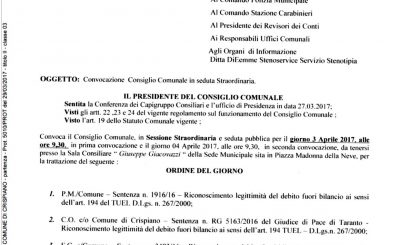 Convocato il Consiglio Comunale,in sessione straordinaria e seduta pubblica per il giorno 3 Aprile 2017 alle ore 9,30,in prima convocazione e il giorno 4 Aprile 2017 in seconda convocazione,da tenersi presso la Sala Consiliare”Giuseppe Giacovazzi” della sede Municipale sita in Piazza Madonna della Neve. Fonte: .