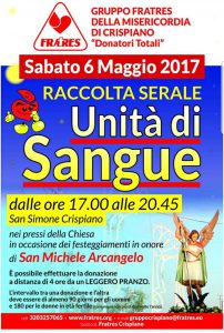 C’è sempre bisogno di Sangue … Sabato 06 maggio 2017, a San Simone, in occasione dei festeggiamenti di San Michele Arcangelo, il Gruppo Fratres della Misericordia, ha organizzato una Raccolta di Unità di Sangue Serale nei pressi della Parrocchia, dalle 17.00 alle 20.45. L’ autoemoteca, il personale medico e paramedico della A.S.L. Taranto 1, sarà a disposizione per il prelievo della “Linfa Vitale”. Si informa che è possibile effettuare la Donazione di Sangue a distanza di 4 ore da un LEGGERO PRANZO.