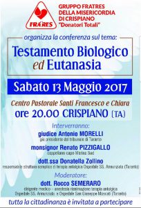 La Fratres di Crispiano ha organizzato per sabato 13 maggio 2017 – ore 20.00, presso il Centro Pastorale Santi Francesco e Chiara, la conferenza sul tema: “Testamento Biologico ed Eutanasia”. Vi aspettiamo …