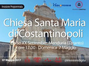 Manduria, 04 maggio 2017 COMUNICATO STAMPA Manduria, domenica 7 maggio la chiesa di Santa Maria diventa social Visita guidata gratuita di Vento Refolo per “Invasioni Digitali” Nel lontanissimo 626 i Persiani invasero Costantinopoli, ma i cristiani respinsero il nemico affidandosi alla Vergine. Nacque così il culto della Madonna che ancora oggi porta il nome della capitale bizantina. Di segno totalmente opposto sarà, invece, l’invasione della Chiesa di Santa Maria di Costantinopoli programmata a Manduria domenica 7 maggio. Per il quarto anno consecutivo, infatti, la locale associazione Vento Refolo organizza nella città messapica un raid, culturale e pacifico, nell’ambito dell’iniziativa internazionale denominata “Invasioni Digitali”. L’intento è quello di coinvolgere quanta più gente possibile nella riscoperta di un bene culturale del territorio, facendo leva sulla disponibilità degli ‘invaders’ a testimoniare l’esperienza, attraverso scatti fotografici, selfie, post o qualsiasi altro metodo di condivisione sui social network. Tra le chiese barocche più belle della città di Manduria, quella dedicata a Santa Maria di Costantinopoli, attigua all’ex Convento degli Agostiniani, fu parrocchia succursale della Chiesa Matrice sino al 1928, quando divenne parrocchia autonoma, dando compimento così alla volontà della benefattrice Marianna Giannuzzi, che nel suo testamento del 1795 aveva espresso il desiderio di istituire una seconda parrocchia, mettendo a disposizione per questo le rendite del proprio patrimonio. Tra le bellezze della chiesa, il fastoso altare maggiore e la mirabile statua in pietra della Madonna di Costantinopoli, datata 1725. Chiunque potrà partecipare all’invasione digitale della chiesa, liberamente e in forma gratuita. Per dare modo all’organizzazione di contare l’”esercito” di Manduria, è comunque preferibile effettuare una piccola prenotazione sul sito Invasionidigitali.it. Basterà cercare nel calendario la data del 7 maggio e l’evento di Manduria, a cui iscrivere il proprio nome. La visita guidata della chiesa sarà condotta dalle guide professionali di Vento Refolo, tutte accreditate presso la Regione Puglia. Il raduno degli invasori è fissato alle ore 17.00, in piazza Garibaldi. Questi gli hashtag per il racconto social: #santamariamanduria #invasionidigitali. Associazione di Promozione Sociale Vento Refolo – Via Loisio dello Preite, 114 – 74024 Manduria (TA) www.ventorefolo.itinfo@ventorefolo.it – cell. 333/4875023 – fax 099/67231171 – C.F. 90192490739