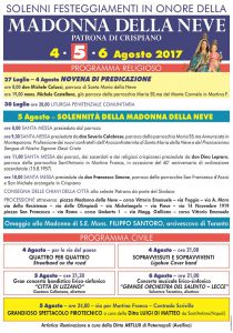 CRISPIANO – FESTA PATRONALE 2017 – COMUNICATO STAMPA Sono entrati nel vivo a Crispiano i solenni festeggiamenti in onore della Madonna della Neve (4-5-6 agosto), celeste patrona della cittadina jonica, a cura della parrocchia della Chiesa madre retta da don Michele Colucci. La novena in preparazione alla festa (27 luglio – 4 agosto, ore 19) viene presieduta da mons. Michele Castellana, già parroco della parrocchia Maria SS.ma del Monte Carmelo in Martina Franca. Il programma civile prevede, per il pomeriggio del 4 agosto, il giro per le vie del paese del gruppo dei “Quattro per Quattro” di Santeramo in Colle, mentre alle 21, in piazza Madonna della Neve, si esibiranno i “Sopravvissuti e sopravviventi”, una delle migliori cover band di Ligabue, proveniente da Bitonto. Il giorno centrale della festa è sabato 5 agosto, solennità della Madonna della Neve. La data è quella indicata nel Messale romano come “festa della dedicazione della basilica di Santa Maria maggiore”, il cui titolo latino è Santa Maria ad nives. Il soffitto della chiesa madre di Crispiano riprende architettonicamente, anche se in maniera più modesta, quello della celebre basilica romana. La pia tradizione vuole che sia stata la stessa Vergine Maria a indicare e ispirare la costruzione di una chiesa a lei dedicata sull’Esquilino. Apparendo in sogno contemporaneamente al pontefice Liberio (papa dal 352 al 366) e al patrizio Giovanni, la Madonna chiese la costruzione di un tempio in suo onore, in un luogo che lei stessa avrebbe miracolosamente indicato. E infatti, il mattino del 5 agosto 358 il colle romano dell’Esquilino apparve inspiegabilmente ammantato di neve. Il Papa tracciò il perimetro della nuova chiesa e il nobile Giovanni provvide alla costruzione dell’edificio, ritenuto il tempio mariano più antico dell’Occidente e da sempre una delle più importanti basiliche di Roma. L’arrivo a Crispiano di questo titolo attribuito alla parrocchia si deve a mons. Giuseppe Antonio de Fulgure, arcivescovo di Taranto dal 1818 al 1833, il quale nel 1826 istituiva la prima parrocchia crispianese denominandola “Santa Maria della Neve”, quando Crispiano era ancora un villaggio dipendente amministrativamente da Taranto (sarebbe divenuto comune autonomo nel 1919). Da allora il popolo di Crispiano, che già onorava la Madonna col semplice titolo di “Santa Maria di Crispiano” (chiesa vecchia presso le grotte del Vallone, sec. XIV), si è messo sotto la protezione di Maria. Subito dopo la Seconda guerra mondiale, la Madonna della Neve venne proclamata protettrice di Crispiano (5.8.1945). La festa richiama ogni anno un gran numero di crispianesi che per vari motivi dimorano lontano dal paese d’origine. Nella mattinata del 5, sante messe: alle ore 8,00 presieduta dal parroco; alle ore 9,30 presieduta da don Saverio Calabrese, parroco di Monteparano, già parroco di Santa Maria della Neve; alle ore 11,00 presieduta da don Dino Lepraro, sacerdote crispianese da lunghi anni parroco di S. Antonio in Martina Franca, che celebra 60 anni di ordinazione sacerdotale, essendo stato ordinato il 15.8.1957. Alle ore 18,00 santa messa presieduta da don Francesco Simone, parroco di S. Francesco d’Assisi e S. Michele arcangelo in Crispiano. Subito dopo, in piazza Madonna della Neve, la tradizionale consegna delle chiavi della città alla celeste patrona da parte del sindaco Egidio Ippolito, cerimonia molto attesa e sempre ricca di suggestione che precede la tradizionale, partecipatissima processione dell’immagine della Madonna della Neve per le vie del paese, protagoniste anch’esse con i loro abitanti di un vero e proprio tripudio di gioia al passaggio della Madonna, che col suo sguardo benedicente saluta ammalati e persone altrimenti impossibilitate a uscire di casa. Al rientro della processione, tutta la popolazione si unisce nella preghiera intonando l’inno alla Madonna della Neve, composto da mons. Giuseppe Maria Caforio (1878-1965), per oltre mezzo secolo arciprete di Crispiano. Il tradizionale omaggio a Maria al termine della processione è affidato anche quest’anno a S.E. Mons. Filippo Santoro, arcivescovo di Taranto. Subito dopo, l’esibizione del Concerto lirico sinfonico “Città di Lizzano” diretto dal maestro Gaetano Cellamara. A mezzanotte, spettacolo pirotecnico sulla via per Martina Franca, contrada Scriville. Il 6 agosto, alle ore 21, esibizione del Concerto musicale lirico-sinfonico “Grande orchestra del Salento – Lecce” diretto dal maestro Salvatore Tarantino. PARROCCHIA SANTA MARIA DELLA NEVE – CRISPIANO (Taranto) Tel. 099616027 – 3407702255 – e-mail: donmichelino69@libero.it