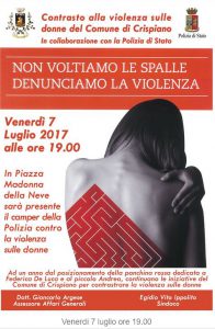 Comune di Crispiano Nota Stampa Proseguono a Crispiano le iniziative per il contrasto alle violenze di genere Venerdì in piazza Madonna della neve il camper della Polizia di Stato Ad un anno circa dal posizionamento, nella principale piazza di Crispiano, di una panchina rossa dedicata a Federica De Luca e al figlio Andrea, continuano le iniziative per contrastare la violenza sulle donne. Venerdì 7 luglio 2017, dalle ore 19,00, nella stessa piazza Madonna della Neve, sosterà il camper della Polizia di Stato che da tempo svolge attività itinerante di formazione e sensibilizzazione rispetto alla problematica della violenza sulle donne. All’iniziativa, denominata “ non voltiamo le spalle, denunciamo la violenza”, fortemente voluta dal sindaco Egidio Ippolito e dall’assessore agli affari generali Giancarlo Argese, prenderanno parte anche i genitori di Federica De Luca. Dott. Giancarlo Argese Assessore Affari Generali Crispiano 06-07-2017