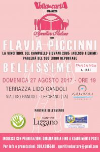 Aperitivo d’Autore riporta a “casa” Flavia Piccinni Nuova tappa del format che coniuga cultura ed enogastronomia. Stavolta si va a Gandoli: ospite la scrittrice tarantina che presenta “Bellissime”, il libro-inchiesta di cui tanto si sta parlando. Appuntamento a domenica alle ore 19 Ad agosto Aperitivo d’Autore si fa al mare, non poteva essere diversamente. L’appuntamento è per domenica 27, al tramonto, a Lido Gandoli, su una delle terrazze più belle della nostra litoranea ionica. Ospite la scrittrice tarantina Flavia Piccinni, già vincitrice del Campiello Giovani con il romanzo d’esordio “Adesso tienimi” oltre che di numerosi altri riconoscimenti. Si parlerà del suo libro-inchiesta “Bellissime” (Fandango Libri), uscito da poco ma che sta già facendo parlare parecchio, tanto da aver innescato due interrogazioni parlamentari. Il suo è un viaggio nel mondo delle baby modelle e aspiranti lolite. Firmando un ritratto toccante e realistico, la Piccinni ha acceso una luce nel mondo delle bambine di oggi che molto avranno a che fare con quello che sarà l’Italia nei prossimi trent’anni. A coccolare il pubblico, oltre alle onde del mare, ci penseranno le prelibatezze preparate da Valentina De Palma, chef della struttura, e i freschi vini delle Cantine Lizzano. Si comincerà alle 19. Introdurrà la serata l’ideatore di Aperitivo d’Autore, Vincenzo Parabita. Dialogherà con la scrittrice la giornalista Stefania Ressa. Partner dell’evento sono anche Se dico Taranto e Libreria AmicoLibro. Per partecipare all’evento è obbligatorio prenotare chiamando al numero 380.4385348 oppure scrivendo all’indirizzo email aperitivodautore@gmail.com L’AUTRICE Nata a Taranto nel 1986, Flavia Piccinni è scrittrice e giornalista. Prima di Bellissime, ha curato due antologie, pubblicato i romanzi Adesso Tienimi (Fazi, 2007), Lo Sbaglio (Rizzoli, 2011) e Quel fiume è la notte (Fandango, 2016), il saggio sulla ‘ndrangheta La mala vita (Sperling&Kupfer, 2012). Ha vinto numerosi premi letterari (fra cui il Campiello Giovani) e radiofonici (l’ultimo è il Marco Rossi). Fa parte della redazione di Nuovi Argomenti. Collabora con Radio3 Rai, con Rai 1 e con diversi giornali. È coordinatrice editoriale della casa editrice Atlantide. Attualmente vive tra Lucca e Roma. IL LIBRO Ci sono bambine che imparano presto a truccarsi, a sorridere, a essere simpatiche e maliziose. Sognano di fare le miss o le modelle. Hanno mamme disposte a guidare ore e ore nella notte per portarle a sfilare a Pitti Bimbo e padri capaci di organizzare tour de force per trovare il vestito adatto a un casting. Sono bambine di quattro, cinque, sei anni che popolano un mondo poco noto, spesso nascosto, che si declina attraverso riviste patinate, cataloghi e pubblicità. Un mondo sommerso che non può superare il metro e trenta di altezza, e che è destinato a farsi perpetuo laboratorio di stereotipi fra promesse di futuro e frustrazioni. Dai centri commerciali del napoletano alle periferie toscane, passando per la riviera romagnola e l’hinterland milanese, Flavia Piccinni ha seguito decine di selezioni, sfilate e concorsi di bellezza. Attraverso un viaggio memorabile nell’infanzia di oggi, “Bellissime” racconta di baby miss e di madri, di sogni che a volte si trasformano in incubi, di ambizioni e di speranze, svelando come nascono i modelli di comportamento e di gusto che tutti acquisiamo attraverso i media, e di cosa questi modelli possono produrre sulla nostra pelle e su quella dei più piccoli. LA LOCATION Immerso nel verde e bagnato dallo Ionio, in uno dei suoi tratti costieri pugliesi più belli e suggestivi, ecco Lido Gandoli, stabilimento balneare dove comodità e comfort si fondono con lo splendido paesaggio circostante. Situato nel territorio di Leporano, gode di un mare chiaro e cristallino che incontra una sabbia morbida e sottile. Una spiaggia sempre calma e riparata in una insenatura naturale dal fondale basso per un lungo tratto, adatta a grandi e bambini. Chiamarlo semplicemente “stabilimento balneare” potrebbe davvero risultare riduttivo. Oltre alla spiaggia attrezzata, vi sono ampie e suggestive terrazze, per passare piacevoli momenti di relax, servite da bar, pizzeria, self service e un ottimo ristorante. E per gli sportivi: campi da beach volley, beach tennis, corsi di acquagym e nuoto con la supervisione di istruttori qualificati. In più, durante tutta l’estate, sono organizzate feste a tema per divertirsi ballando con ottima musica nella meravigliosa cornice della baia. Lido Gandoli è inoltre un sito accessibile a tutti: l’ascensore consente l’accesso in spiaggia a tutte le persone con difficoltà motorie e sono ridotte al minimo le barriere architettoniche. I VINI Con la vendemmia del ’61 nacque la Società Cooperativa Cantine Lizzano, oggi tra le più grandi e moderne del Sud-Italia. Uno dei primi esempi di filiera corta, premiata nel 1989 con il riconoscimento della Denominazione di Origine Controllata (DOC), oggi la cooperativa è tra le più grandi e moderne del Sud-Italia, con oltre 400 soci vignaioli e 500 ettari di vigneti con vitigni autoctoni (Primitivo, Negroamaro, Malvasia, Moscato) e internazionali (Chardonnay, Pinot e Cabernet), unica in Italia presieduta da una donna, Rita Macripò, che porta avanti i valori fondanti della cooperativa con la stessa passione del fondatore. L’azienda rappresenta oggi una realtà cooperativa – con circa 380 soci aderenti – rilevante nel comparto vinicolo, sia in ambito regionale che nazionale (terzo enopolo della Puglia ed uno dei 23 enopoli d’Italia), con una capacità di stoccaggio di 290.000 ettolitri. La cooperativa ha sede a Lizzano, un lembo di terra arido e sassoso sospeso sul mare. Il paese, che ha ricevuto riconoscimenti e premi in numerose rassegne tra le quali il Vinitaly, rientra nel circuito de “Le strade del vino” un percorso di fruizione turistica alternativa che si snoda lungo vigneti, cantin