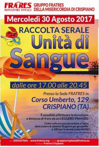DEDICACI QUALCHE MINUTO, LEGGILO TUTTO … GRAZIEEE E … PASSAPAROLA. Ritardi di alcuni interventi, trasfusioni ridotte etc. … questa è la situazione della NOSTRA PROVINCIA “C’È TANTO BISOGNO DI SANGUE”, Il nostro appello, rivolto a tutti coloro che godono di buona salute di dedicare un pò del proprio tempo a coloro che sono in pericolo di vita, che soffrono… il vostro sangue è linfa vitale per chi soffre. Recatevi in qualsiasi centro o punto di raccolta della Provincia . La Fratres di Crispiano, collaborando con la ASL di Taranto, informa che ha organizzato una raccolta di unità di sangue serale per mercoledì 30 agosto 2017, presso la sede. Il personale A.S.L. medico e paramedico sarà a disposizione per la raccolta di unità di sangue dalle 17.00 alle 20.40 . Oltre al requisito di godere di buona salute vi ricordiamo di venire ben riposati, di non venire a digiuno … la donazione è possibile a distanza di tre ore da un leggero pranzo ed evitare se si è raffreddati in maniera evidente. Aspettiamo tutti e … per chi volesse prenotarsi ed evitare lunghe attese, siamo in sede il 25, 28 e 29 agosto p.v., dalle 17.30 alle 19.30, per registrare le vostre prenotazioni.