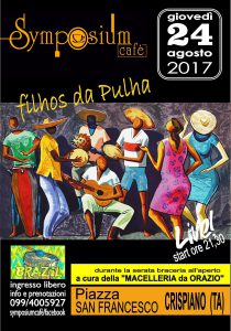 Scariche Sonore, ecco la musica brasiliana dei Filhos da Pulha Il gruppo, composto da musicisti italiani e brasiliani, ha un repertorio di samba tradizionale, bossanova e forrò. L’appuntamento è per giovedì 24 agosto a Crispiano, in piazza San Francesco. Ingresso gratuito Nuovo appuntamento della corposa rassegna musicale Scariche Sonore organizzata dal Symposium Cafè a Crispiano: questo giovedì saranno i ritmi brasiliani dei Filhos da Pulha a riscaldare piazza San Francesco. Il nome della band deriva dal portoghese “figli di Puglia”; si tratta di un progetto musicale composto da musicisti italiani e brasiliani che propone un repertorio di samba tradizionale, bossanova, samba reggae e forrò. La tradizione del grande territorio musicale brasiliano in una formazione a cinque elementi che trasporta il pubblico in atmosfere tropicali e armoniose, dai “botequins” (bar) di Rio de Janeiro alle strade del carnevale di Salvador de Bahia. La band è composta da: Antonio Palmisani – voce, chitarra e cavaquinho Fabrizio Scarafile – sassofono e flauto Umberto Calentini – contrabbasso e basso elettrico Gabriel Andrade do Prado – percussioni e cori Marcelo Areias dos Santos – percussioni e cori La serata comincerà alle 21.30. Il concerto, come sempre, è gratuito. Chi volesse informazioni o intendesse prenotare un tavolo può contattare gli organizzatori allo 099.4005927. Il Symposium Cafè proporrà un’ampia scelta di panini, piatti unici, stuzzicheria, birre, cocktail, gelati e tanto altro. Inoltre ci sarà la possibilità di degustare le specialità gastronomiche di carne alla brace della macelleria da Orazio. Vincenzo Parabita Addetto stampa Scariche Sonore – Symposium Cafè