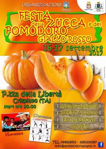 FESTA DELLA ZUCCA E DEL POMODORO GIALLO-ROSSO CRISPIANO (TA) 16 e 17 SETTEMBRE 2017 La zucca ed il pomodoro giallo-rosso, protagonisti a Crispiano di una festa a loro interamente dedicata. Sabato 16 e Domenica 17 Piazza della Libertà si animerà grazie a questa iniziativa della locale Pro Loco, giunta alla ottava edizione. Questo evento continua ad essere proposto in una formula oramai collaudata e di successo, con un connubio tra musica, enogastronomia, artigianato e sport, ma si propone soprattutto di promuovere due prodotti tipici del territorio. Prodotti che, oltre ad avere un’incredibile versatilità in cucina, possiedono indiscusse proprietà benefiche. Ricco il programma delle due serate. In P.zza della Libertà con inizio alle ore 20.00, apertura degli stand in cui saranno in vendita le zucche edibili ed ornamentali e il pomodoro giallo-rosso del territorio delle 100 masserie e vari artigiani esporranno le proprie realizzazioni. Accanto a questi, gli stand enogastronomici, in cui sarà possibile deliziare il palato con varie bontà preparate dai soci-volontari della suddetta associazione. Spazio anche all’arte, con le zucche magistralmente intagliate dai docenti e alunni dell’I.I.S.S. “Elsa Morante” di Crispiano. In entrambe le serate, inoltre, saranno esposte svariate zucche nell’area “guinness” che concorrono per aggiudicarsi tre premi: quello per la zucca più grande, quello per la zucca dalla forma più strana e il terzo per la zucca più piccola. Sabato i visitatori saranno allietati da un concerto della band “I Napolatino”, che esegue un repertorio di musica italiana e straniera, mentre domenica si esibirà la band dei “Nitrophoska” con musica ska-reggae music con accenni di folk revival a seguire premiazione. Inoltre Domenica 17 si terrà un motoraduno “Tour in Vespa e moto d’epoca nel territorio delle 100 masserie”; per info e iscrizioni 3427445762-3357374150. Seguite l’evento sulla pagina Facebook della Pro Loco di Crispiano oppure per informazioni 3283330187.