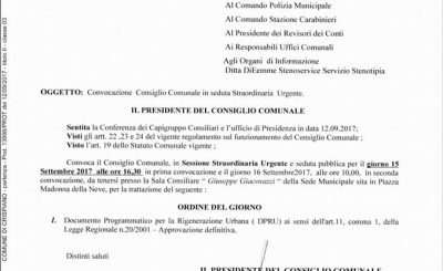 Il Consiglio Comunale di Crispiano è convocato per Venerdì 15 Settembre 2017 alle ore 16,30 in seduta pubblica presso sala consiliare “Giuseppe Giacovazzi”. Ordine del giorno documento programmatico per la rigenerazione urbana. Fonte: .