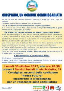 Riceviamo e pubblichiamo Lunedì 30 ottobre 2017 i Consiglieri uscenti della coalizione “Paese Futuro” incontreranno i cittadini, per rendicontare questi anni di Opposizione all’Amministrazione di centro-destra, caduta prima della fine del mandato per le tante defezioni che l’hanno messa in minoranza. L’incontro sarà aperto e pubblico. L’appuntamento è per le 18.30, presso i locali dei Servizi Sociali di Crispiano, siti in via Scaletta, 21.