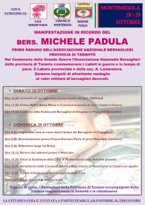 Raduno Provinciale dei Bersaglieri in Ricordo del Bersagliere Michele Padula Montemesola 20 /Ottobre 2017-10-19 COMUNICATO STAMPA In data 28 e 29 Ottobre 2017 PRESSO IL Comune di Montemesola si terrà una manifestazione organizzata dall’ Associazione Nazionale dei Bersaglieri della Provincia di Taranto per commemorare i Caduti in Guerra ed in tempo di Pace in occasione della Grande Guerra. La manifestazione avrà inizio il 28 Ottobre alle ore 16.30 con un momento di raccoglimento presso la tomba del Bersagliere Michele Padula seguirà LA Santa Messa alle ore 17.30 presso la Chiesa Madre.Alle ore 19.30 si terrà IL Concerto della Fanfara dei Bersaglieri di CRISPIANO in Piazza lV Novembre. Alle ore 09.30 del 29 Ottobre2017 inizia la sfilata con la Fanfara dei Bersaglieri Magg. Larosa di Fragagnano con ritrovo Alle ore 10.00 Presso il Municipio per rendere gli onori ai Gonfaloni con Benedizione Della Corona D’Alloro e Deposizione al Monumento ai Caduti, per poi proseguire in parata lungo le vie della Città. Giovedi 26 Ottobre p.v. Presso la Sala Consigliare del Comune di Montemesola ci saràuna Conferenza Stampa . Cordiali saluti Presidente Provinciale A.N.B. Taranto Bers. Vitantoni Bruno
