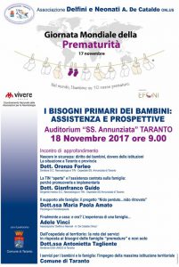 GIORNATA MONDIALE DELLA PREMATURITA TARANTO 17 -18 novembre 2017 L’associazione “Delfini e Neonati – A. De Cataldo” Onlus, insieme alla S.C. Neonatologia e T.I.N. di Taranto, in occasione della Giornata Mondiale della Prematurità, che si celebra in tutto il mondo il 17 novembre, intende richiamare l’attenzione delle Istituzioni cittadine e degli abitanti di Taranto e provincia sulla situazione veramente difficile dell’assistenza in ambito neonatale. Per questa ragione sabato 18 novembre 2017, alle ore 9, presso l’Auditorium dell’Ospedale “SS. Annunziata” di Taranto, organizziamo un incontro di approfondimento dal tema: I bisogni primari dei bambini: assistenza e prospettive (come da programma allegato). Ne parleranno il dott. Oronzo Forleo, direttore della Neonatologia e Terapia Intensiva Neonatale di Taranto, il dott. Gianfranco Guido, la dott.ssa Maria Paola Amato, Adele Vinci, la dott.ssa Antonietta Tagliente, direttrice del distretto socio sanitario Unico di Taranto e l’Assessore ai Servizi Sociali, dott.ssa Simona Scarpati del Comune di Taranto che ha patrocinato l’iniziativa. Inoltre dal 13 al 19 novembre, è prevista l’illuminazione di viola della Fontana Rosa dei Venti di Piazza Ebalia, proprio per attirare l’attenzione dell’opinione pubblica, affinché vengano messe in atto le misure più idonee perché ogni bambino che nasce possa avere la miglior possibilità di vivere una vita felice e sana. Il momento di incontro si sofferma sulla realtà locale in riferimento all’evento nascita, evidenziando gli aspetti che permettono di garantirne la sicurezza necessaria e l’assistenza adeguata. Ogni bambino ha diritto di nascere in sicurezza e, ovunque questo avvenga, ha il diritto di essere assistito adeguatamente soprattutto se questo evento si presenta critico, come accade per i bambini prematuri. Ha diritto, una volta dimesso, di ricevere interventi tempestivi e adeguati in rapporto alle sue condizioni, contando di trovare nel territorio servizi socio sanitari e professionalità adeguate. Risulta quanto mai necessario che le famiglie conoscano le problematiche connesse all’assistenza al bambino prematuro e/o al neonato critico sottolineando come la presenza costante dei genitori, all’interno della Terapia Intensiva Neonatale, svolga un ruolo fondamentale per il benessere e la salute del bambino e per promuovere le competenze genitoriali. Un altro aspetto da sottolineare è la necessità di disporre di un servizio di follow up. La prosecuzione delle cure dopo la dimissione, l’individuazione precoce di disturbi neurologici e di deficit sensoriali, ma anche di anomalie transitorie sono fondamentali per un neonato pretermine, perché consentono di mettere in atto gli interventi tempestivii necessari. Sottovalutare questi aspetti può avere esiti drammatici per i bambini e le loro famiglie. Non ultimo, intendiamo raccontare l’angoscia e la solitudine delle famiglie dopo la dimissione soprattutto in presenza di disfunzioni di diversa natura connesse alla prematurità. Qui entra in campo il ruolo dei servizi territoriali, sanitari e sociali, che in azione sinergica e integrata, come prevede la nostra normativa, dovrebbero garantire, sul territorio, le prestazioni necessarie. Evidenziarne carenze e criticità, ma anche punti di forza, consente di porsi in un’ottica di miglioramento affinché i bambini e le loro famiglie possano trovare le risposte adeguate ai loro bisogni. Certi dell’attenzione Cordiali Saluti Dora Tagliente Presidente dell’Ass. Delfini e Neonati