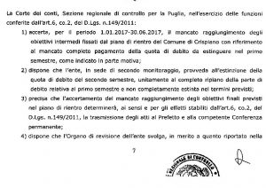 Riceviamo e pubblichiamo Sul primo monitoraggio semestrale (1.1.2017 – 30.6.2017) del Piano di rientro del Comune di Crispiano la Corte dei Conti con delibera del 23 ottobre 2017 (che pubblichiamo), ha dato esito negativo. In particolar modo per l’esposizione debitoria, la Corte dei Conti scrive che “l’obiettivo di ripiano previsto è lontano dall’essere raggiunto”. Quindi, “l’Ente presenta ancora difficoltà sul versante delle spese suscettibili di pregiudicare l’effettivo raggiungimento dell’obiettivo finale di risanamento”. Pertanto, in occasione del monitoraggio del secondo semestre (1.7.2017 – 31.12.2017) il Comune di Crispiano, “dovrà aver ripianato la quota di debito del secondo semestre, unitariamente a quella del primo semestre non estinta nel periodo di riferimento”. La Corte riprende nella delibera quanto aveva già rilevato, cioè: “una grave sofferenza di cassa”, “il reiterato ricorso all’anticipazione di tesoreria”, “la scarsa efficacia della lotta all’evasione tributaria”, “l’inefficiente attività di riscossione delle entrate tributarie”… E così la condizione in cui ci troviamo oggi è gravissima. Perché, con la crisi economica e con i tagli statali della spending review la situazione, come in tantissimi altri Comuni italiani, si era fatta delicata e bisognava affrontarla con serietà. l’Amministrazione Ippolito l’ha fatta precipitare. Un amministratore accorto mette in campo le politiche adatte a ciò che trova da amministrare, non a ciò che c’è solo nel suo immaginario. È giusto avere sogni, idee e progetti, ma questi devono avere un minimo di fondamento nella realtà. Le politiche che hanno messo in campo, non solo non affrontavano con rigore la situazione, ma non hanno nemmeno minimamente avuto dei ritorni sul territorio, al di là delle chiacchiere dette e ridette. Stendiamo poi un velo pietoso sui toni trionfalistici dell’ex Sindaco Ippolito sui Social Network e negli pseudo comizi in piazza che davano il risanamento già raggiunto, solo per averlo detto. E adesso? La serietà dimostrata finora da parte del Commissario prefettizio fa ben sperare per un impegno che ci faccia cambiare il passo in questo percorso. Noi come coalizione Paese Futuro chiederemo un incontro al Commissario, per avere un’idea dei provvedimenti che si intendono prendere e per dare il nostro contributo di idee. Se non si raggiungono gli obiettivi, l’inverno sarà molto molto lungo. Si spera che chiunque si proporrà per il prossimo governo di Crispiano, lo faccia con piena cognizione di causa, proponendo specifiche competenze, affrontando il confronto elettorale senza prendere in giro i cittadini, ma parlando loro con schiettezza e consapevolezza della reale situazione.