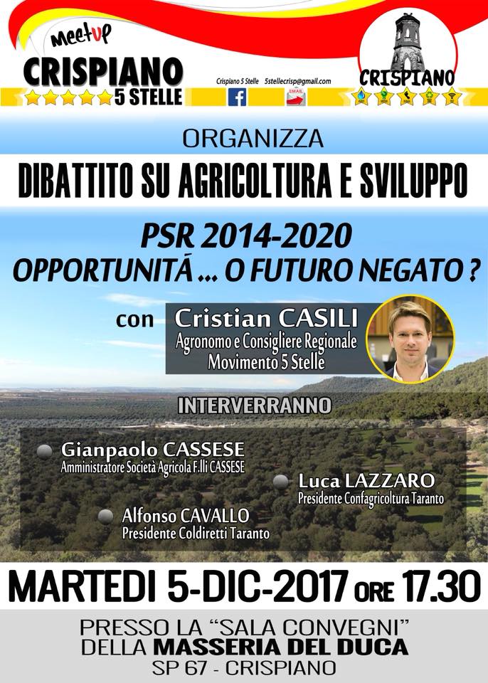 Il Meetup Crispiano 5 Stelle è lieto di invitarvi al dibattito su Agricoltura e Sviluppo, che si terrà il prossimo 5 dicembre presso la sala convegni della Masseria Del Duca a Crispiano alle ore 17.30.