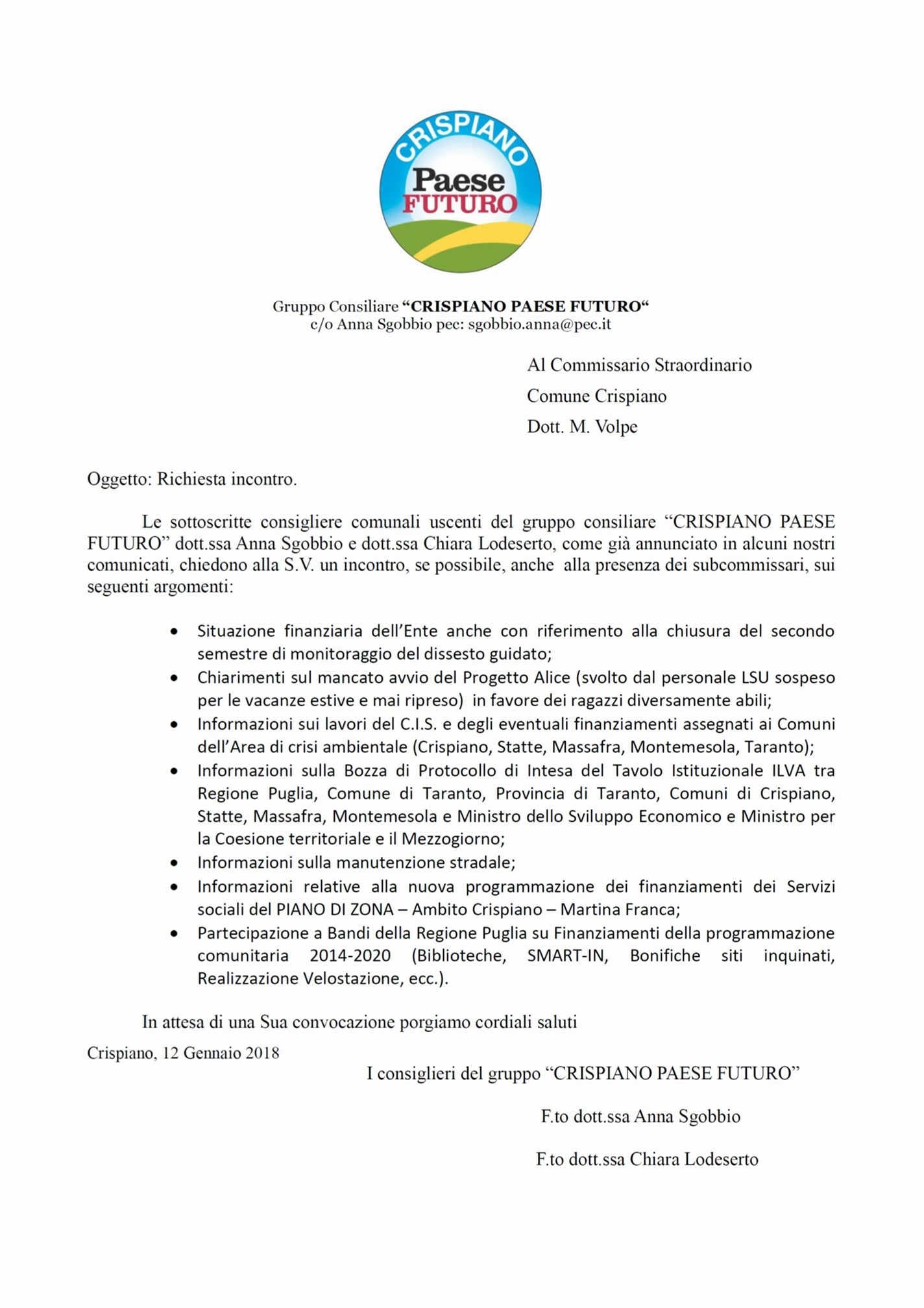 Con la lettera del 12 gennaio scorso, che qui alleghiamo, le consigliere comunali uscenti Anna SGOBBIO, già capogruppo, e Chiara LODESERTO hanno richiesto al Commissario Straordinario un incontro per richiedere informazioni sugli importanti argomenti che sono elencati nella lettera. La problematica più importante riguarda il monitoraggio sul secondo semestre, scaduto il 31.12.2017, del piano di rientro richiesto dalla Corte dei Conti nel 2016. Abbiamo aspettato qualche mese dall’insediamento del Commissario anche per permettergli di conoscere in maniera più approfondita le problematiche che riguardano il nostro Comune. Il Commissario ha fissato l’incontro per il 2 febbraio 2018 alle ore 10. Vi informero sulle informazioni che ci verranno date.