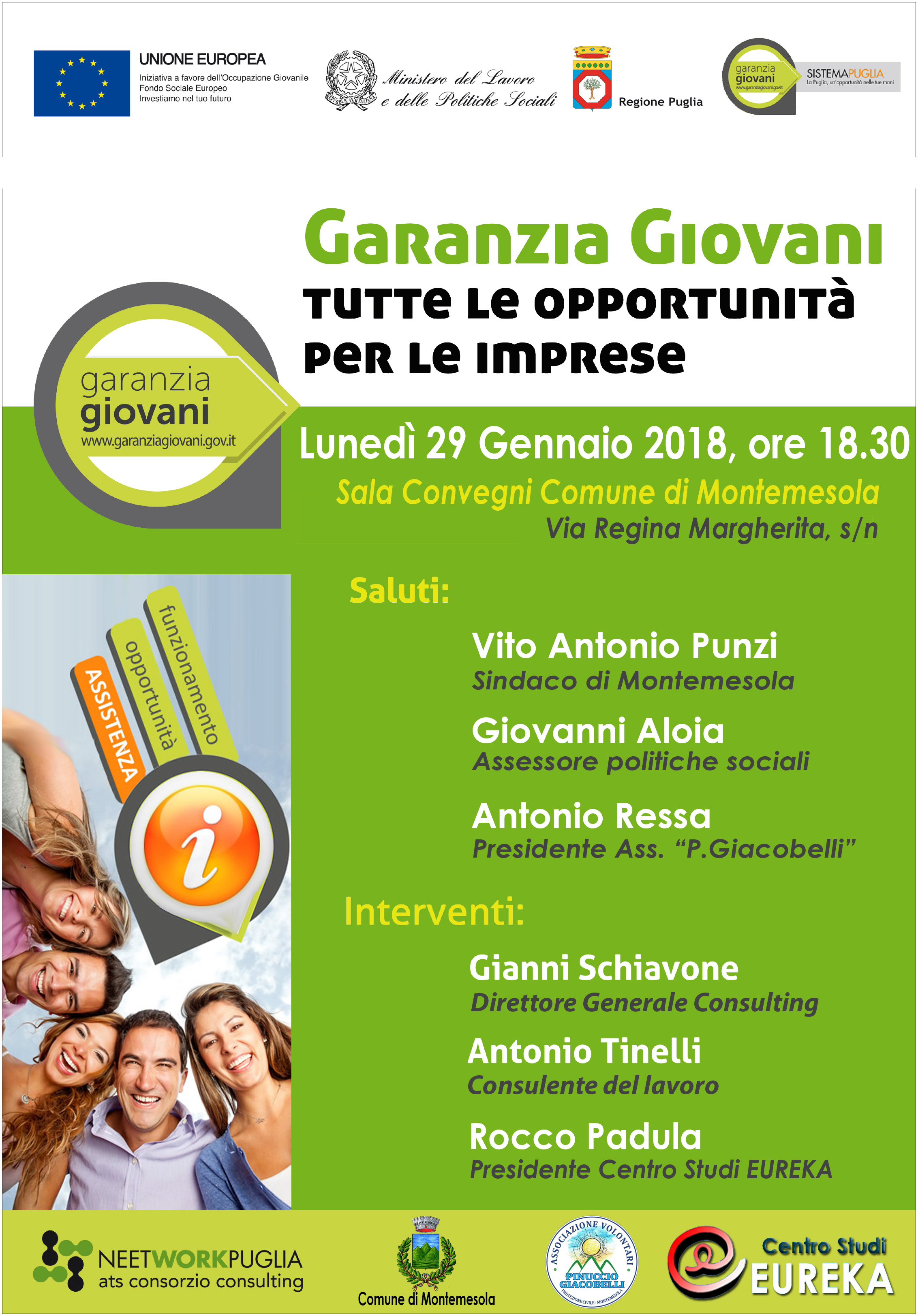 Lunedì 29 Gennaio 2018 alle ore 18.30 presso la Sala Convegni del Comune di Montemesola in via Regina Margherita, sarà presentato alla cittadinanza il progetto di “Garanzia Giovani” che l’amministrazione comunale sta avviando con il Centro Studi EUREKA, accreditato dalla Regione Puglia come sportello informativo del progetto.