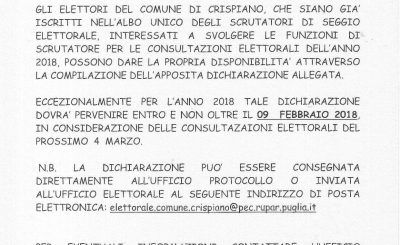 COMUNE DI CRISPIANO Ufficio Elettorale GLI ELETTORI DEL COMUNE DI CRISPIANO, CHE SIANO GIA’ ISCRITTI NELL’ALBO UNICO DEGLI SCRUTATORI DI SEGGIO ELETTORALE, INTERESSATI A SVOLGERE LE FUNZIONI DI SCRUTATORE PER LE CONSULTAZIONI ELETTORALI DELL’ANNO 2018, POSSONO DARE LA PROPRIA DISPONIBILITA’ ATTRAVERSO LA COMPILAZIONE DELL’APPOSITA DICHIARAZIONE ALLEGATA. ECCEZIONALMENTE PER…