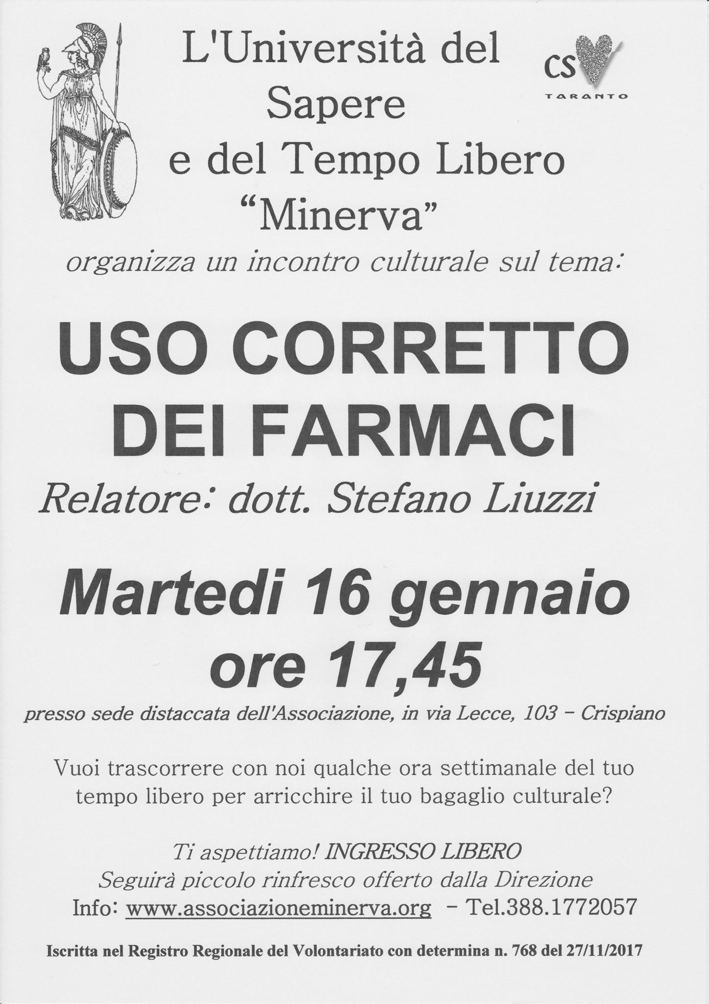MARTEDI 16 GENNAIO alle ore 17,45, per questo inizio di anno, presso la SEDE DISTACCATA dell’associazione in VIA LECCE, 103 (piano terra) a Crispiano, l’ Università del Sapere e del tempo libero “Minerva”, organizza il suo 11° appuntamento della nuova stagione