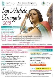 Anche quest’anno, a nome della Parrocchia San Michele Arcangelo del Borgo San Simone nel Comune di Crispiano, sono lieto di annunciare la festa in onore del suo patrono, sperando che essa sia un’occasione in più offerta da Dio per riscoprire la bellezza di essere una comunità cristiana, protetta dall’Arcangelo Michele. La festa in onore di San Michele ricade in un anno particolarmente importante per la comunità di San Simone, infatti il prossimo 1 maggio ricorre il 60º anniversario dalla istituzione della Parrocchia per volere dell’Arcivescovo di Taranto Monsignor Ferdinando Bernardi nel 1958; inoltre l’8 maggio la Chiesa Parrocchiale compirà 80 anni dalla sua consacrazione nel 1938. In occasione di questi importanti anniversari, la festa assume un valore del tutto diverso e pertanto ho pensato di arricchire il programma dei festeggiamenti con un avvenimento speciale: dal 28 aprile al 1 maggio la nostra chiesa di San Michele accoglierà la statua di San Michele con la spada ritenuta miracolosa, proveniente dal Santuario di Monte Sant’Angelo sul Gargano. La nostra comunità ha un legame particolare con il Santuario, infatti la festa di San Michele si celebra non il 29 settembre (festa liturgica degli Arcangeli Michele, Gabriele e Raffaele), ma l’8 maggio, giorno delle apparizioni dell’Arcangelo Michele sul Gargano. Mi piace riproporre il messaggio che consegna apparendo al vescovo Lorenzo Maiorano nel V secolo: «Là dove si spalanca la roccia possono essere perdonati i peccati degli uomini. Quel che sarà qui chiesto nella preghiera sarà esaudito». Due elementi emergono chiaramente: l’urgenza della preghiera e la necessità di uscire dal peccato. In sintesi è il messaggio del Vangelo, della Buona Novella che affonda nella vita di grazia l’esistenza di ogni uomo. Questo messaggio, seppur circoscritto al territorio del Gargano, è valido per tutta la cristianità ancora oggi. A tutti coloro che hanno lavorato, a tutti coloro che festeggeranno, il mio più sincero augurio. Buona festa!