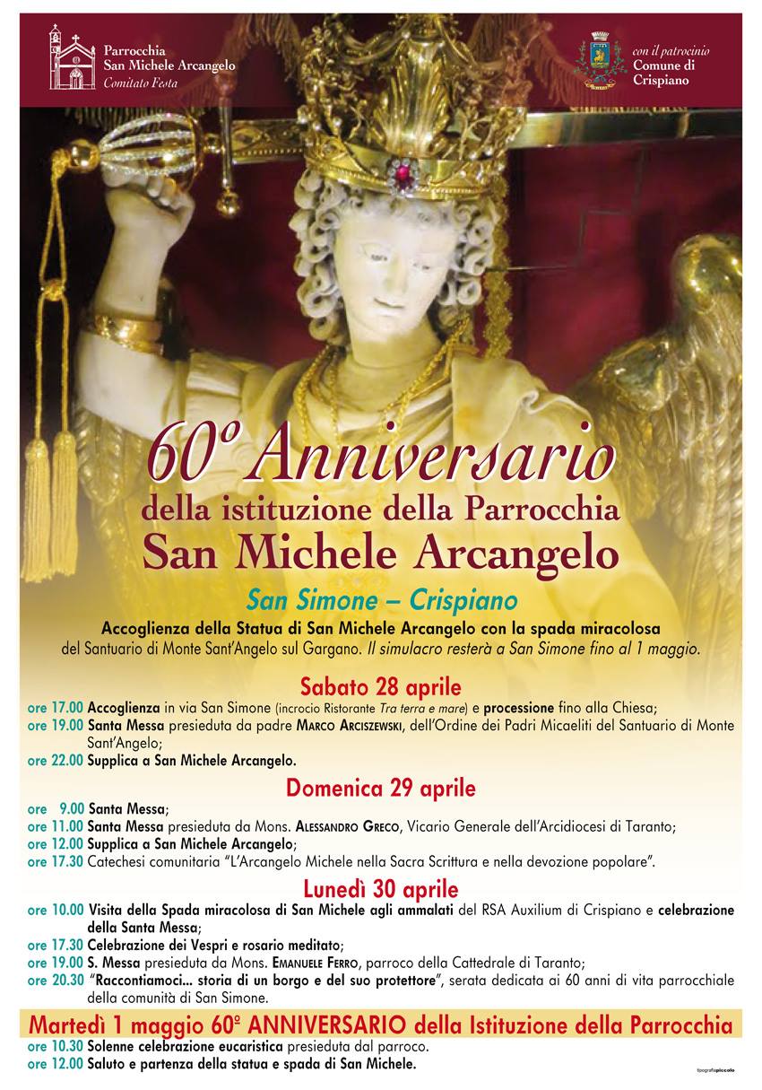 Anche quest’anno, a nome della Parrocchia San Michele Arcangelo del Borgo San Simone nel Comune di Crispiano, sono lieto di annunciare la festa in onore del suo patrono, sperando che essa sia un’occasione in più offerta da Dio per riscoprire la bellezza di essere una comunità cristiana, protetta dall’Arcangelo Michele. La festa in onore di San Michele ricade in un anno particolarmente importante per la comunità di San Simone, infatti il prossimo 1 maggio ricorre il 60º anniversario dalla istituzione della Parrocchia per volere dell’Arcivescovo di Taranto Monsignor Ferdinando Bernardi nel 1958; inoltre l’8 maggio la Chiesa Parrocchiale compirà 80 anni dalla sua consacrazione nel 1938. In occasione di questi importanti anniversari, la festa assume un valore del tutto diverso e pertanto ho pensato di arricchire il programma dei festeggiamenti con un avvenimento speciale: dal 28 aprile al 1 maggio la nostra chiesa di San Michele accoglierà la statua di San Michele con la spada ritenuta miracolosa, proveniente dal Santuario di Monte Sant’Angelo sul Gargano. La nostra comunità ha un legame particolare con il Santuario, infatti la festa di San Michele si celebra non il 29 settembre (festa liturgica degli Arcangeli Michele, Gabriele e Raffaele), ma l’8 maggio, giorno delle apparizioni dell’Arcangelo Michele sul Gargano. Mi piace riproporre il messaggio che consegna apparendo al vescovo Lorenzo Maiorano nel V secolo: «Là dove si spalanca la roccia possono essere perdonati i peccati degli uomini. Quel che sarà qui chiesto nella preghiera sarà esaudito». Due elementi emergono chiaramente: l’urgenza della preghiera e la necessità di uscire dal peccato. In sintesi è il messaggio del Vangelo, della Buona Novella che affonda nella vita di grazia l’esistenza di ogni uomo. Questo messaggio, seppur circoscritto al territorio del Gargano, è valido per tutta la cristianità ancora oggi. A tutti coloro che hanno lavorato, a tutti coloro che festeggeranno, il mio più sincero augurio. Buona festa!