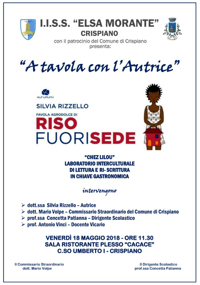Venerdì 18 maggio, alle h. 11.30, presso l’Istituto Alberghiero “Elsa Morante” di Crispiano (Ta) – Sala ristorante, plesso “Cacace” (C.so Umberto I), con il patrocinio del Comune di Crispiano, concesso dal Commissario straordinario dott. Mario Volpe, si svolgerà l’evento “A tavola con l’autrice – Chez Lilou”. Una significativa iniziativa che vuole “cuocere insieme” intercultura e gastronomia in un amalgama mai sperimentato prima tra i banchi di una scuola per parlare ai giovani di temi attuali delicati quali: le diversità culturali, l’accoglienza e l’immigrazione non con discussioni frontali, ma con il metodo “learning by doing” che, valorizzando i talenti di ciascuno li rende protagonisti del fare, mettendo in pratica ciò che si impara.