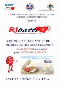 Crispiano solidale partecipa a iniziative valide per salvare la vita. Un primo impegno della Giunta comunale, nel 2012, consentì di dotare la Misericordia, per il servizio 118, di un defibrillatore semiautomatico con monitor, una bombola ossigeno portatile da 16lt, un monitor multiparametrico, un set completo di pallone silicone – adulto e pediatrico con mascherina e un pulsossimetro a dito. Nel 2013 le società sportive GSD Olimpia e ASD Ragazzi Sprint, con una splendida iniziativa di solidarietà denominata “Partecipate numerosi… per il cuore dei nostri ragazzi” acquistarono un defibrillatore medico, donato al Comune per il campo sportivo. Nel 2017 l’Oratorio della parrocchia di Santa Maria Goretti viene dotato di un defibrillatore, donato in memoria di Lino Luccarelli dalla famiglia; anche il Centro pastorale di San Francesco e Santa Chiara dispone dell’apparecchio di soccorso, donato in memoria del giovane Francesco Semeraro. Altri defibrillatori sono stati donati dall’ Associazione Fratres ai plessi scolastici del paese. Ora un’altra iniziativa encomiabile delle Acli provinciali di Taranto, attuata con l’utilizzo del 5xmille, denominata “Ribatti…affidaci il tuo cuore”, sostenuta dal locale Circolo Acli “La Fenice” in collaborazione con il Comune di Crispiano, darà la possibilità alla nostra comunità di avere un altro defibrillatore, collocato nella Piazza della Libertà, molto frequentata soprattutto nei giorni di mercato. La cerimonia di consegna del defibrillatore avverrà giorno 24 p.v., alle ore 17,30.