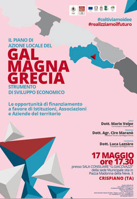 Il nuovo incontro “Il Piano Di Azione Locale del GAL Magna Grecia: strumento di sviluppo economico” si terrà, alle ore 17.30 di giovedì 17 maggio, presso la Sala Consiliare “G. Giacovazzi” nel Municipio di Crispiano, in Piazza Madonna della Neve n.3.